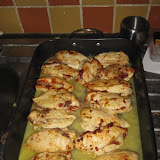 The second course was simple, and probably a little less inspired. I took chicken breasts and salted and peppered them. stuffed with a slice of prosciutto and some mozzarella. Coated the stuffed breast in flour and seared it off in the pan. Then all 15 got tossed in a roasting pan, had some wine poured around them and finished in the oven. The peperonata is basically sauteed onions, peppers and tomatoes, cooked until super soft (almost melting). I seasoned mine pretty aggressively with chili flake, so it had a great heat to it. The "russeled potatoes" are a Rus Goya specialty. Coat chopped red potatoes in olive oil, thyme, rosemary, salt, pepper and chili flake. Roast until they stick hard to the bottom of the pan, and are delicious and crispy on top, tossing occasionally. The chicken was nice and moist, with great saltiness from the prosciutto. It paired real well with the heat from the peperonata. The potatoes were great, like they always are.